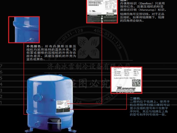 2、銘牌:丹佛斯標(biāo)識(shí)(Danfoss)只采用獨(dú)特紅色。美優(yōu)樂活塞壓縮機(jī)的標(biāo)簽底部還印有(Maneurop)標(biāo)識(shí)。銘牌四角可見預(yù)切線。對于正品壓縮機(jī),如果將銘牌撕下,銘牌的四角將會(huì)缺失。